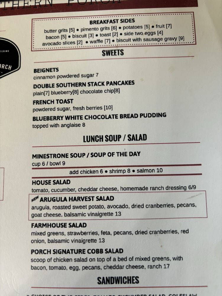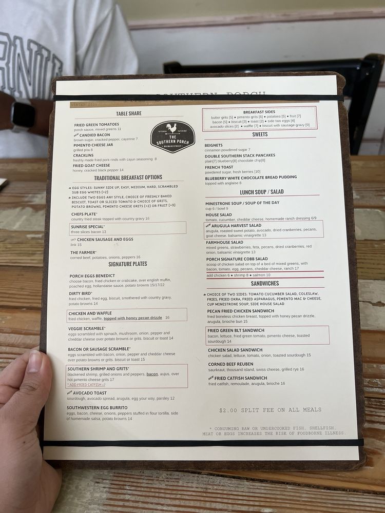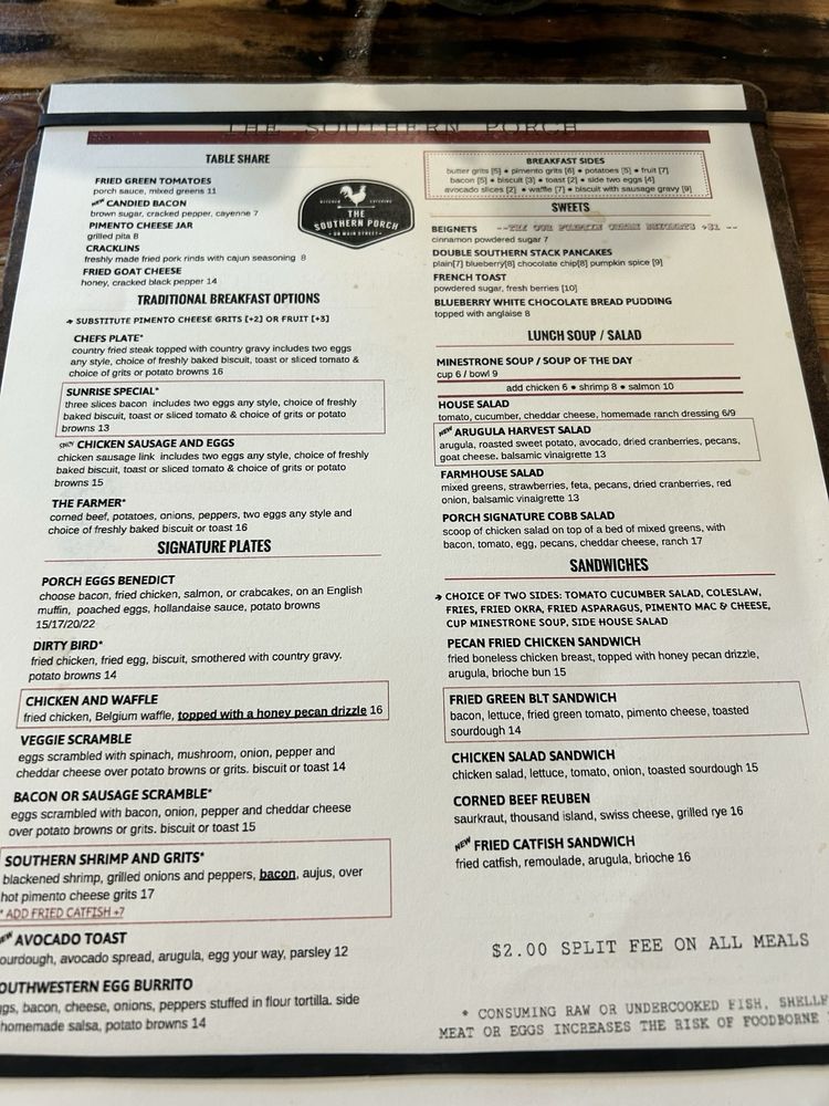 Introducing Southern Porch, a cozy breakfast and brunch spot located in Alpharetta, GA. With a wide range of options including signature plates like the Chefs Plate and The Wife, delicious sandwiches, and hearty omelettes, there is something for everyone. Customer reviews rave about the tasty food, friendly service, and inviting atmosphere. Specialties like shrimp and grits, chicken and waffles, and beignets are must-tries. The Arugula Harvest Salad with added chicken is a favorite among guests. The Southern Porch exudes southern hospitality and charm, making it a popular choice for locals and visitors alike. If you're looking for a delicious bite of breakfast or brunch in a cozy setting, Southern Porch is the place to be.